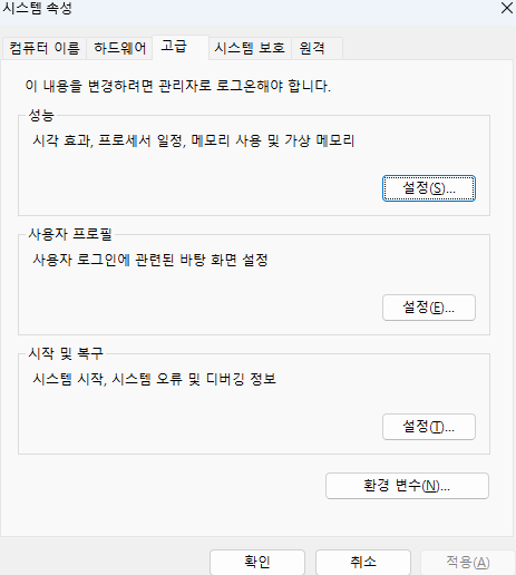 1. 시스템 환경 변수 편집 > 고급 > 환경 변수 선택